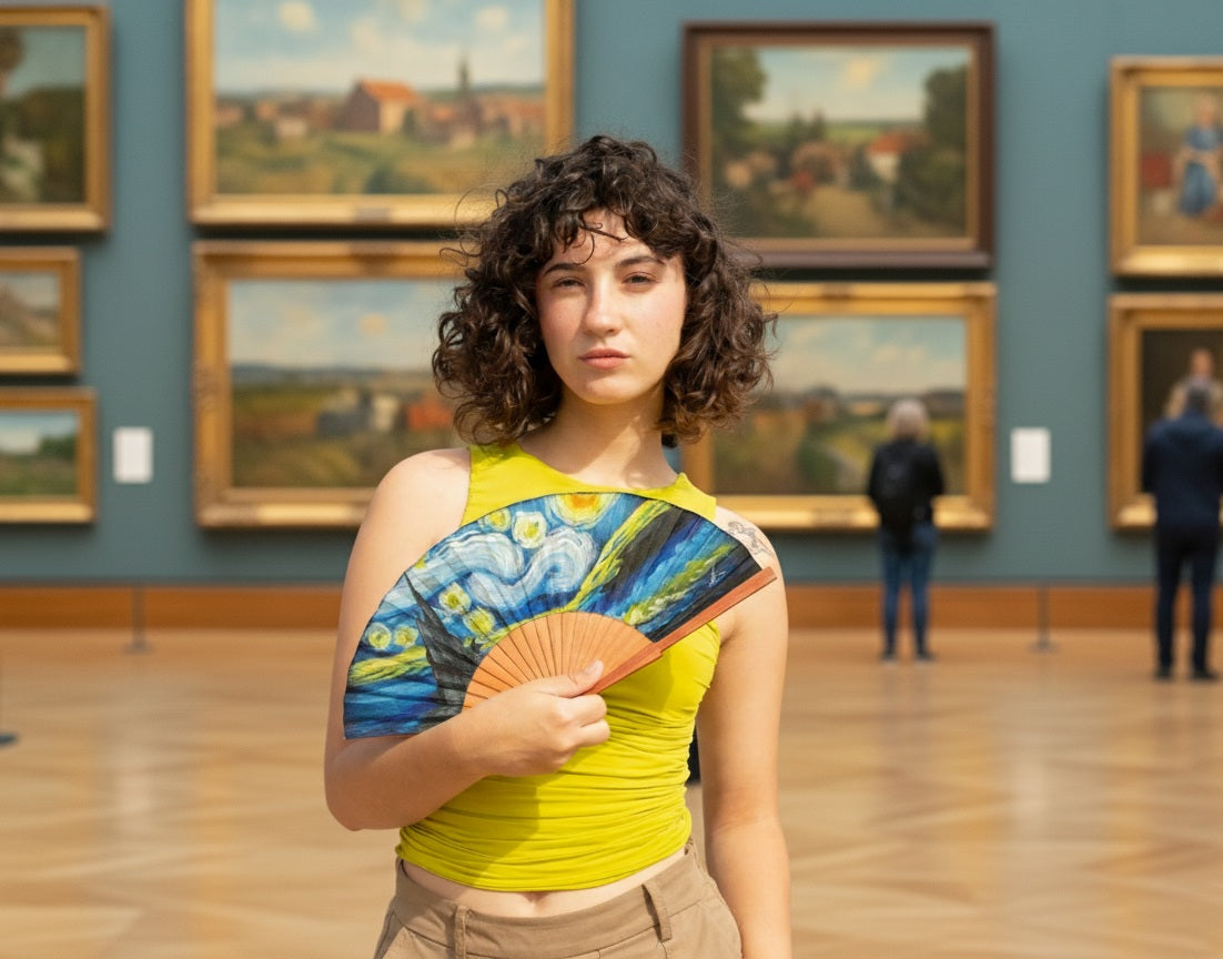 El vigoroso abanico La Noche Estrellada en el que se plasma uno de los cuadros más valiosos de Vincent Van Gogh totalmente pintado a mano hace de él, un abanico más que especial. Energéticas pinceladas de formas y colores reflejan un nocturno pueblo sereno que contrasta con la virulencia de un notable cielo interminable.