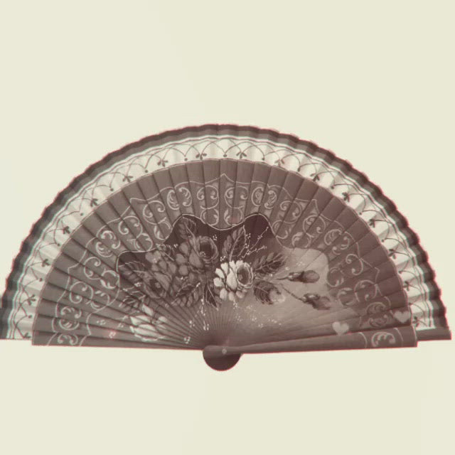 La cantidad de detalles minuciosos, su delicado calado y hermosa pintura en madera combinando dorados, tierras y tintes blancos logrando un estridente rosa consiguen de Orquesta di Fiori un abanico único.