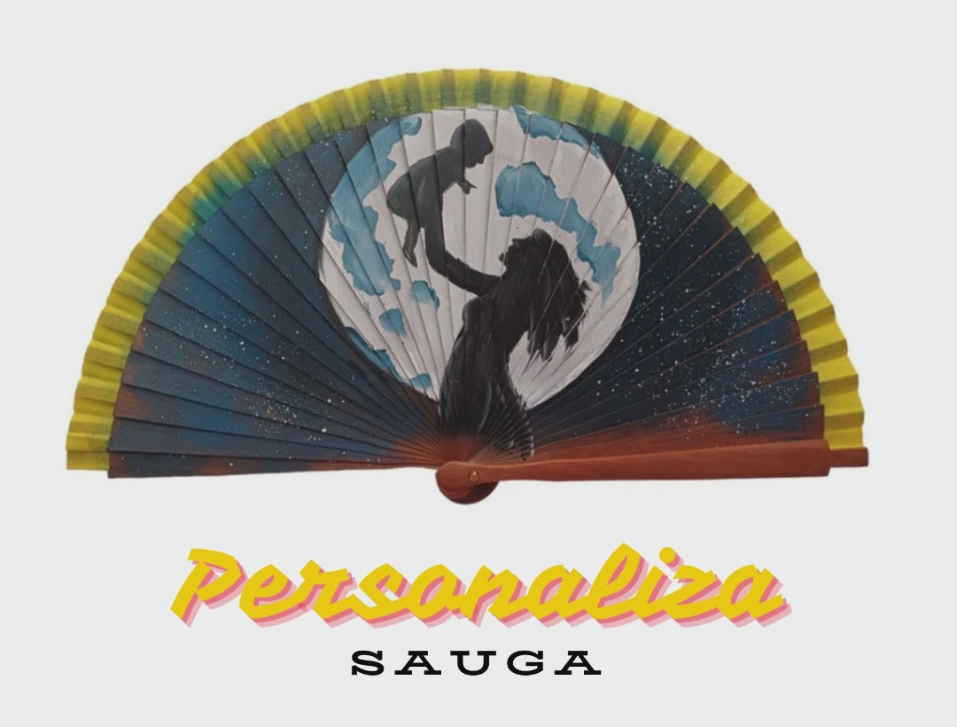 El abanico artesanal Luz de mamá, pintado a mano, captura el instante de amor puro: una mujer eleva con ternura a su bebé bajo la luz serena de una luna llena. Su expresión refleja alegría y protección, mientras el resplandor lunar envuelve la escena con un aura de calidez y conexión.