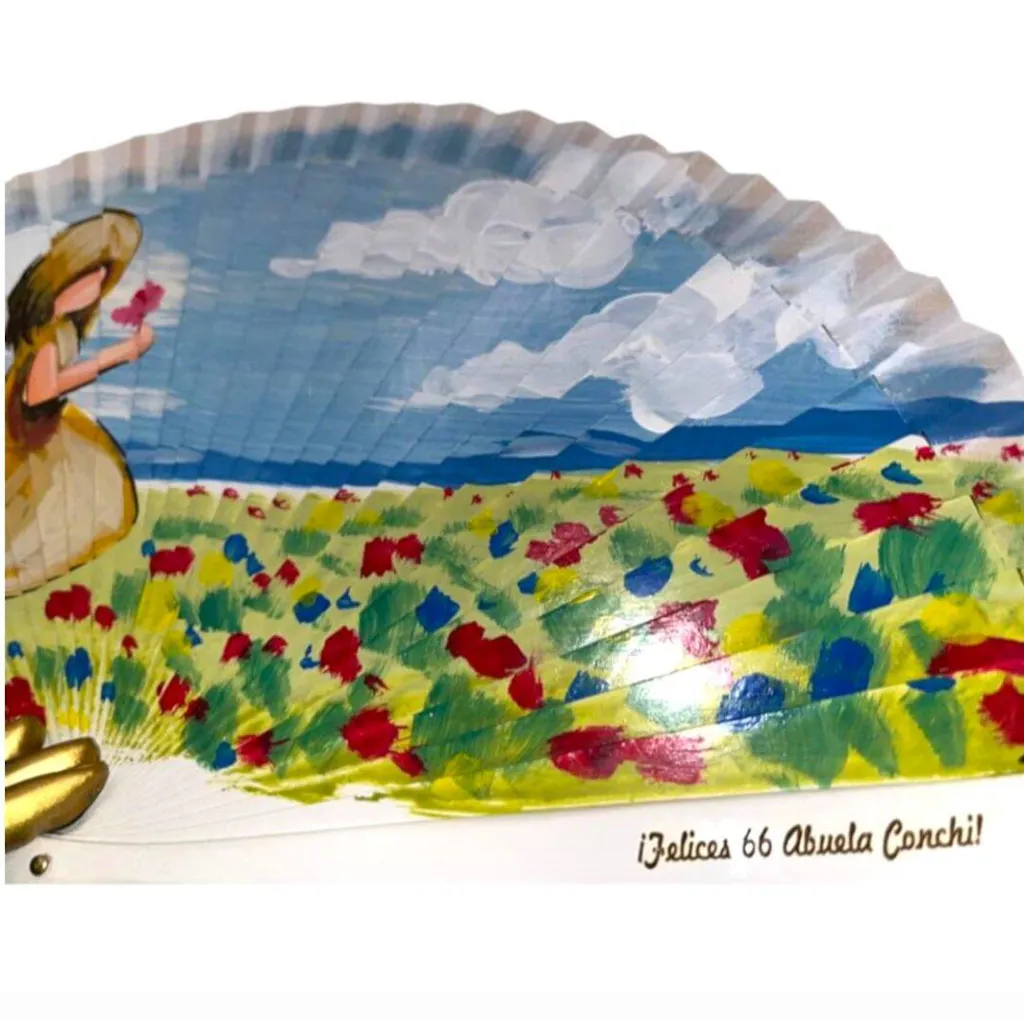 El abanico artesanal Pradera de sueños, pintado a mano muestra el rostro de una niña que asoma una expresión dulce y soñadora, como si estuviera perdida en un mundo de fantasía de colores y curiosidad.